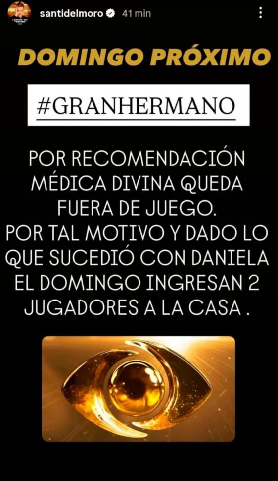 En un comunicado dirigido a sus seguidores a través de sus historias de Instagram, el conductor del reality show, Santiago del Moro, expresó de manera directa y contundente: “Por recomendación médica, Divina queda fuera de juego”, subrayando que esta decisión está vinculada a cuestiones de salud que impiden su regreso a la competencia.