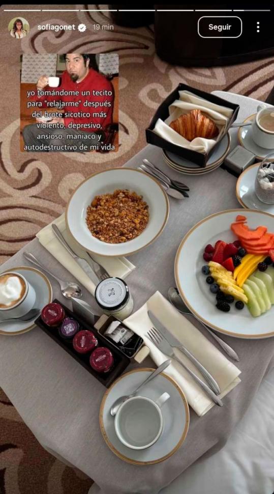 En una segunda historia, la influencer compartió con sus seguidores un instante de serenidad matutina, donde mostró su desayuno, que consistía en café, frutas, un croissant y granola, lo que sugiere un intento de normalidad en su vida diaria tras la controversia.