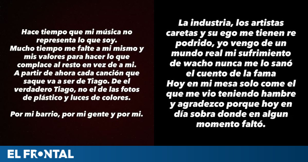 El intérprete, originario de Montegrande, afirmó: “Hace tiempo que mi música no representa lo que soy. Mucho tiempo me falté a mí mismo y a mis valores para hacer lo que complace al resto en vez de a mí”. En una publicación en sus historias de Instagram, Tiago añadió: “A partir de ahora, cada canción que saque va a ser de Tiago. Del verdadero Tiago. No el de las fotos de plástico y luces de colores”.