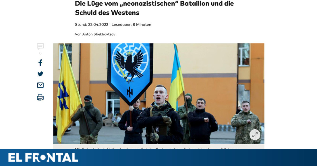 En su artículo publicado el 22 de abril, titulado "La mentira del batallón 'neonazi' y la culpa de Occidente", el politólogo ucraniano Antón Shejovtsov, experto en los movimientos de extrema derecha, acusó a los medios rusos de "llamar la atención de Occidente" y utilizar con fines de "propaganda" al "supuestamente 'fascista' o 'neonazi'" batallón ucraniano Azov.