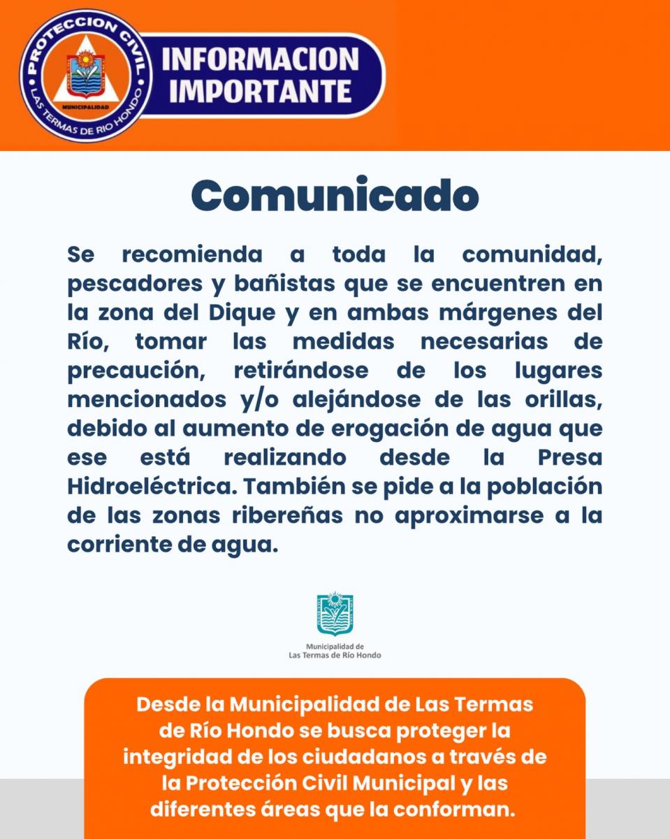 La comunidad de Las Termas de Río Hondo, así como los pescadores y bañistas que se encuentren en las inmediaciones del Dique y las márgenes del Río Dulce, deben adoptar las medidas de precaución necesarias, retirándose de las áreas mencionadas y manteniéndose alejados de las orillas. Esta recomendación surge a raíz del incremento significativo en la erogación de agua desde la Presa Hidroeléctrica, lo que podría generar situaciones de riesgo.